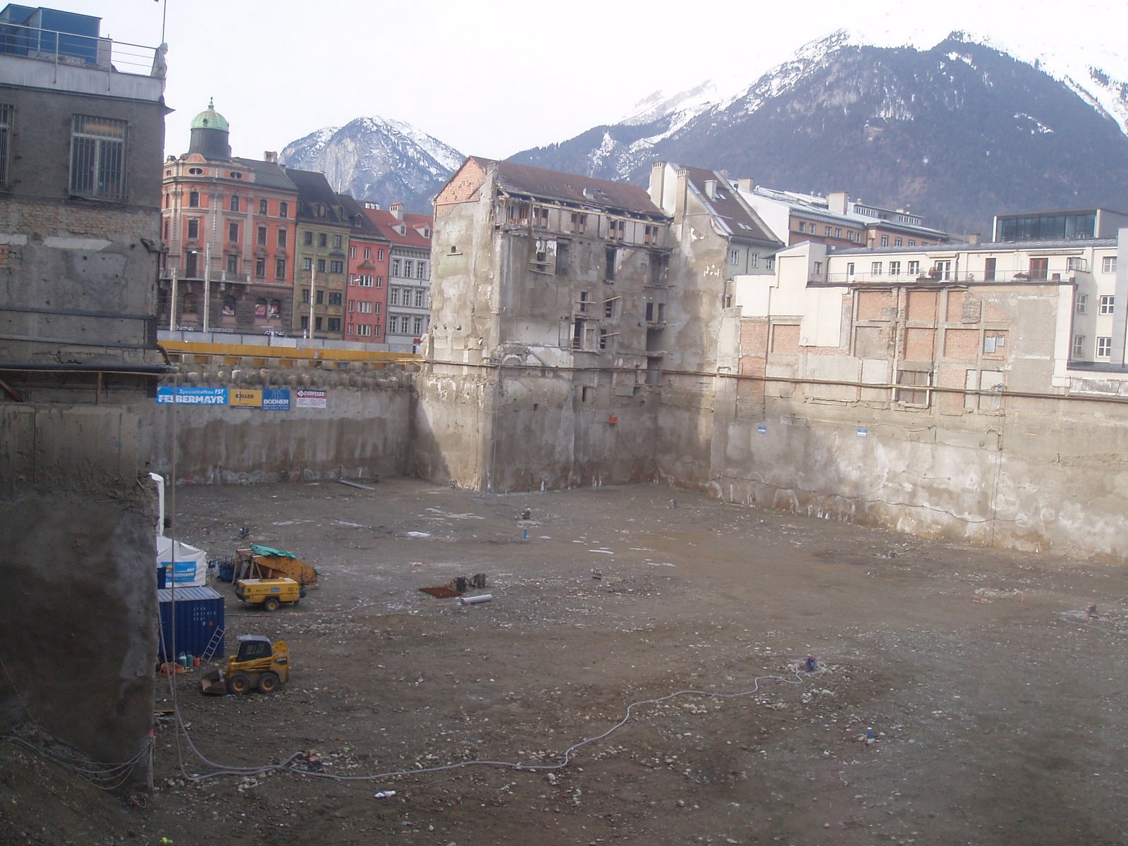 Back to modern times. Although not the only formerly-Jewish-owned business in Innsbruck, this one seems to have had permanent bad luck. Since I have lived here it’s been closed for long-term renovations twice, and now they’ve gone and plowed the whole thing under to start again. Last year there were artist’s renditions of the planned new facade shown in front of the construction site, something that resembled a giant igloo (all white and round) — at some point these plans were scrapped and now the building is to have a more traditional-looking facade, something which will fit in better with the old buildings surrounding it.