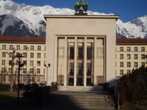 >Innsbruck is Tirol’s capital, and the Landhaus is the seat of the state government. It has a beautiful 18th century facade but the back of it was rebuilt in 1938-40 in what we’ve all come to think of as Ugly Socialist Style. On the rear side of the building over the entrance (not shown) one finds three stone squares; the one on the left is a stone cut of the Tirolean coat-of-arms, on the right that of Vorarlberg (which had been merged with Tirol into one Gau at the time.) The square in the middle is empty, and I was told by a local historian that that is where the swastika was.