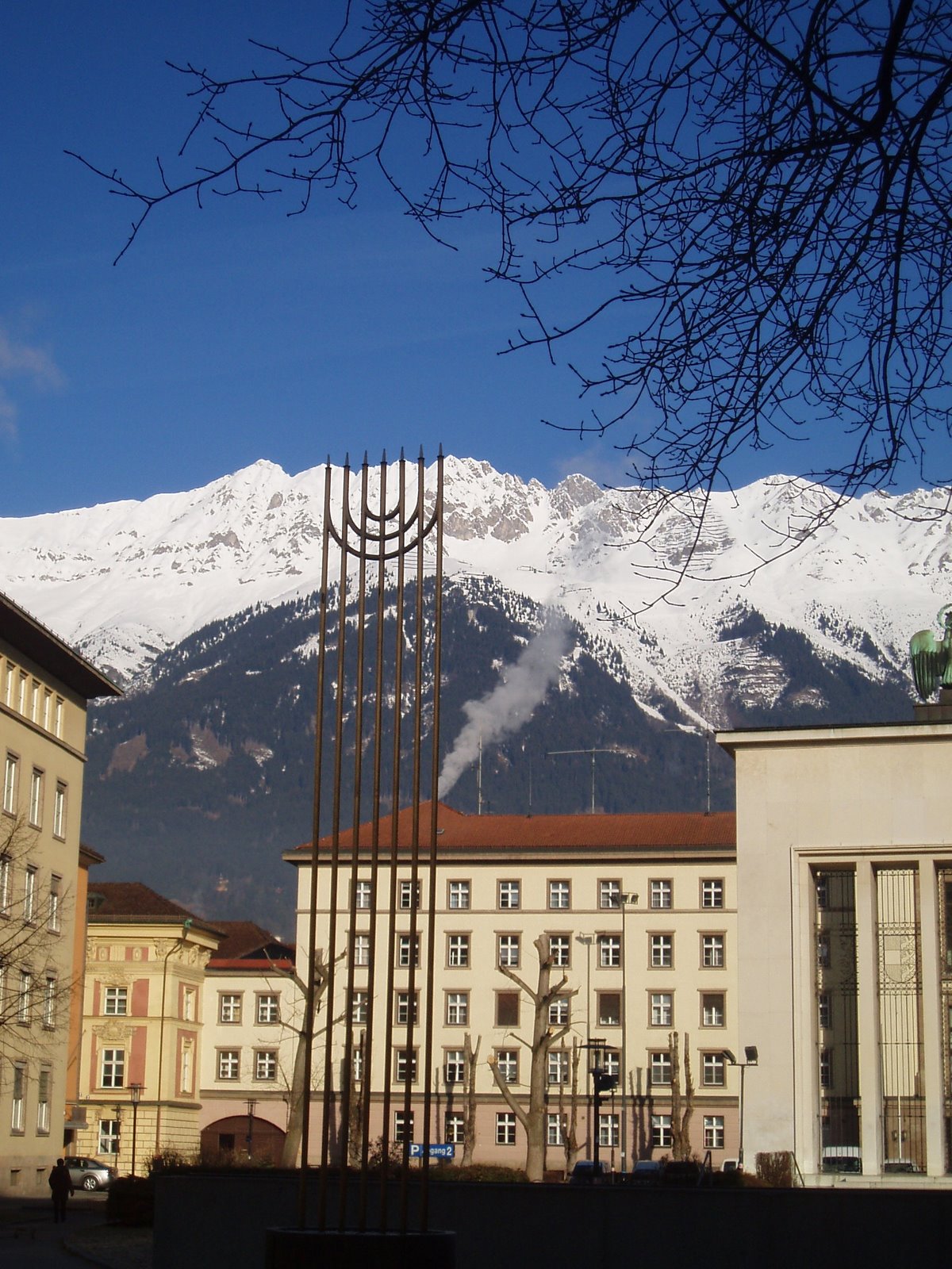 A few dozen meters from the French monument stands a much smaller memorial for the victims of Kristallnacht, November 9 1938. This was the result of a project initiated by the state government in 1997 and awarded to the winner of a local student design competition, the costs taken care of by the state. (The right-leaning Kronenzeitung came out with a complaint, predictably prefacing it’s gripes about money and questions about ulterior motives with “Nothing against memorials, but —.”) The memorial features a menorah design, and a separate sign nearby with the details of the pogrom in Innsbruck.