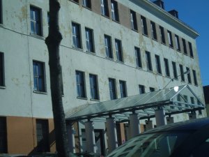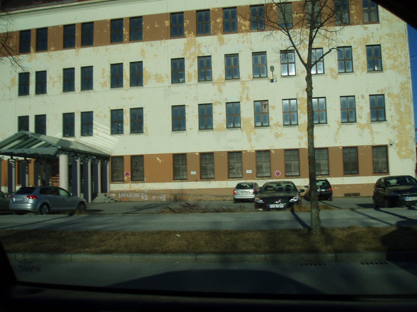 In Munich there is a particular building, attached to a complex of similar buildings, which has this look; massive, with small windows (for more fortress-like protection in case of attack), peeling paint, grass growing in the parking lot. Former Soviet Embassy? Gestapo building? Nope.