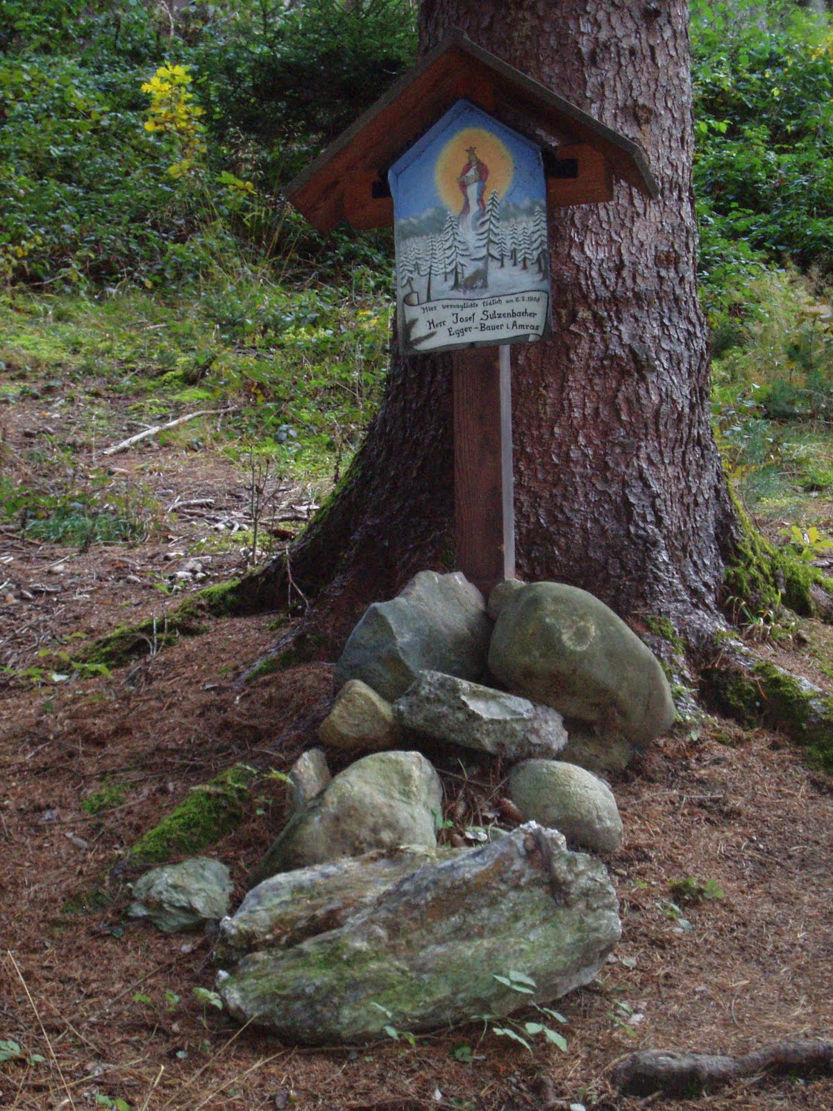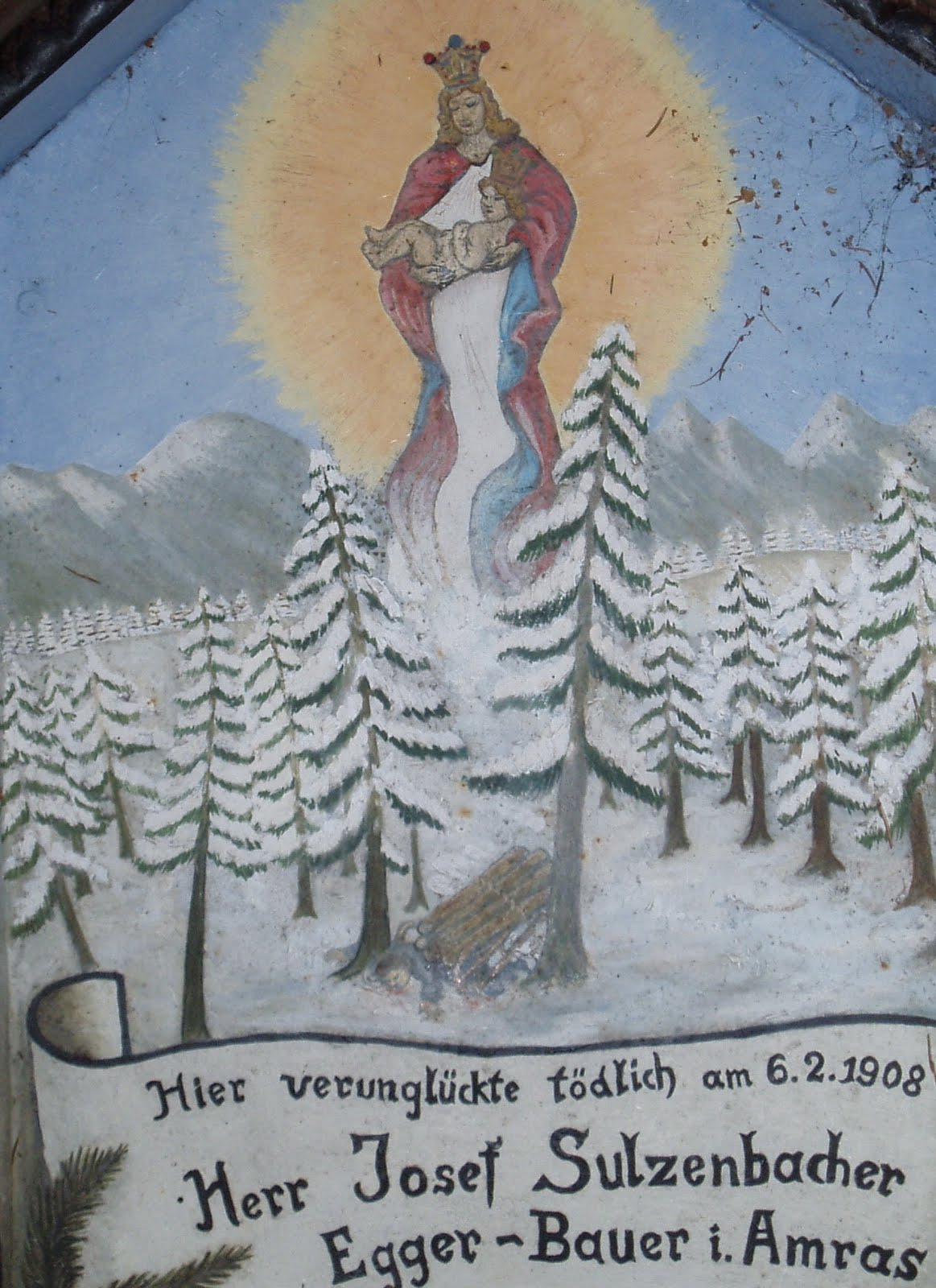 Not a grave, but a little shrine to someone who died at this spot on the hill. You see crosses and plaques like this, as well as tiny chapels, often in the mountains. What makes this one especially interesting is the painting which depicts the manner of the man’s death — it seems he fell, and his sled filled with firewood fell on top of him. I guess. Here’s a close up: