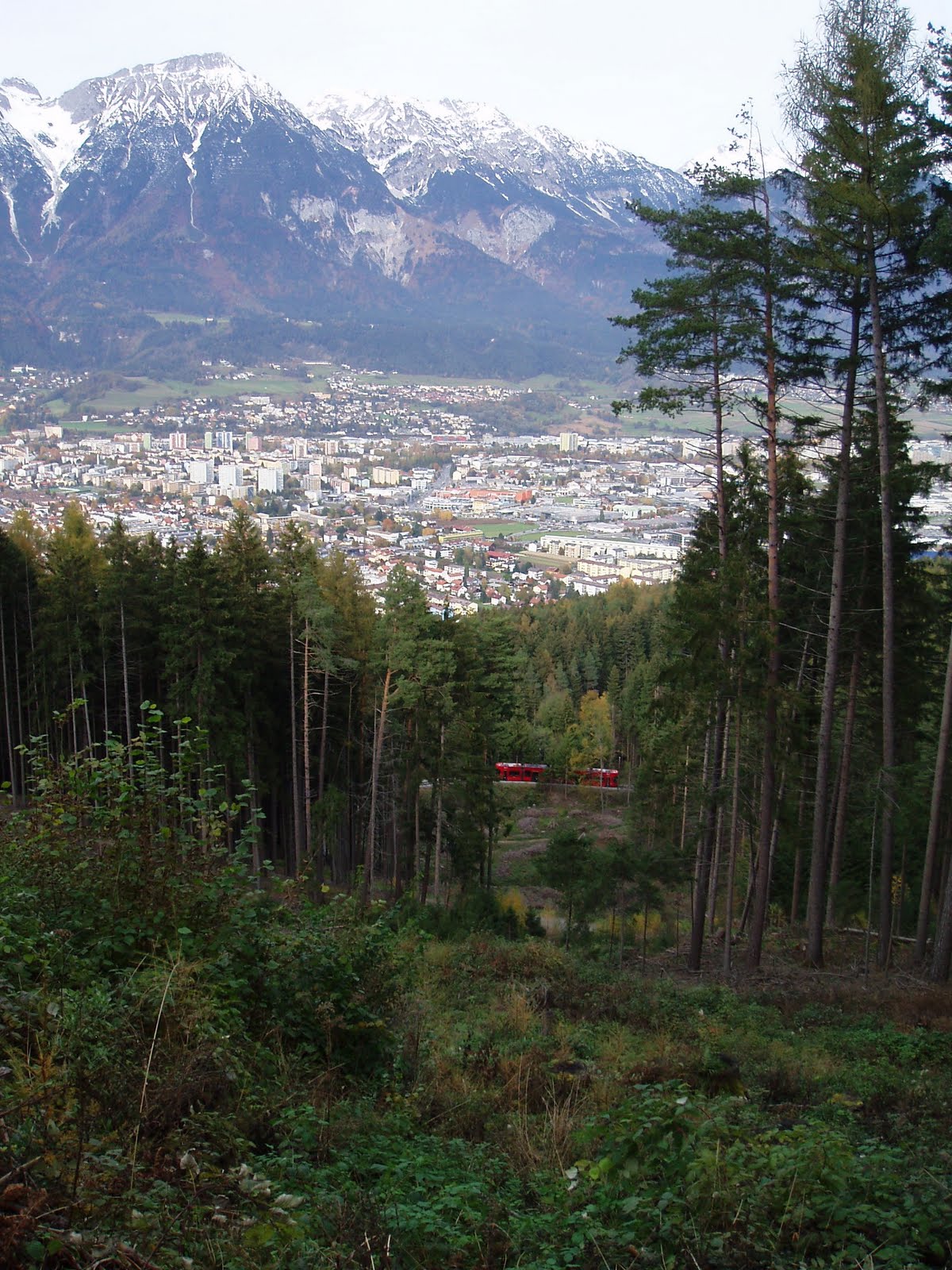 A hike around the Paschberg, at the southern end Innsbruck. Looking back towards town, the Igler Bahn streetcar winds it way up through the forest to the villages on the plateau on the other side of the hill.