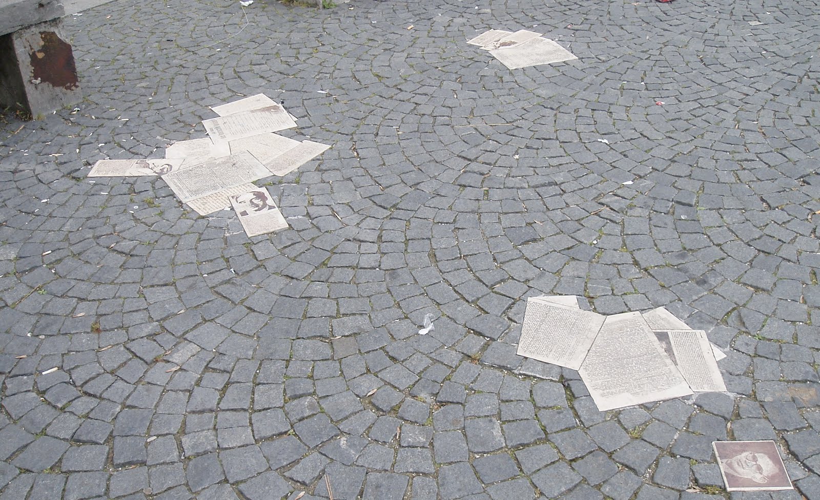What looks like papers lying on the sidewalk is actually part of a monument to the Scholls and to The White Rose resistance group, one of their methods having been to leave anti-nazi leaflets lying around where there were crowds of students.