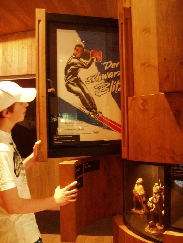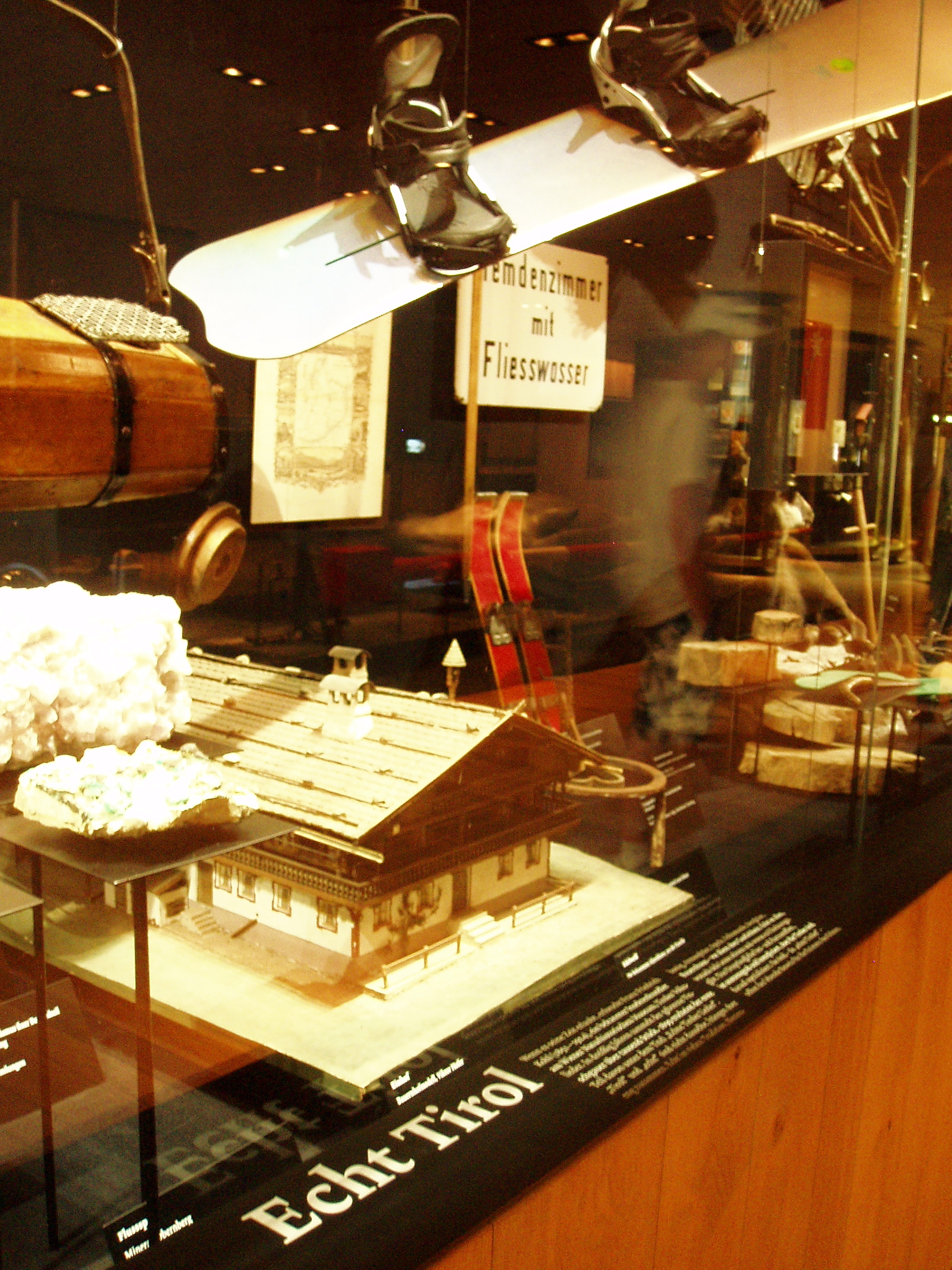 On the other side, a showcase of all manner of local “stuff”, past and almost-present. We didn’t quite get this part; it was as if the museum had to find a way to tie all these objects together and decided to display it almost randomly, with the archaeological finds right next to 20th-century mountain-climbing gear, insect display cases next to old crèches. Sometimes the explanatory signs were not easy to find. We decided that the snowboard must have been Andreas Hofer’s.