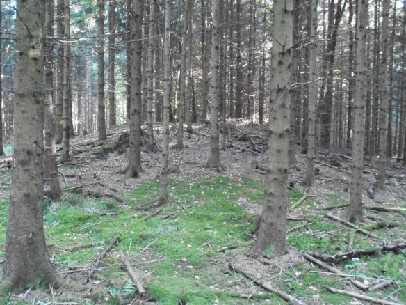 This was not the ideal entrance point, but we couldn’t find a better one. Trying to walk toward the place indicated by the stars, we veered off the path pretty early. On the other side of some swampy grassland surrounded by forest, I could make out something that looked higher than the rest of the forest floor.