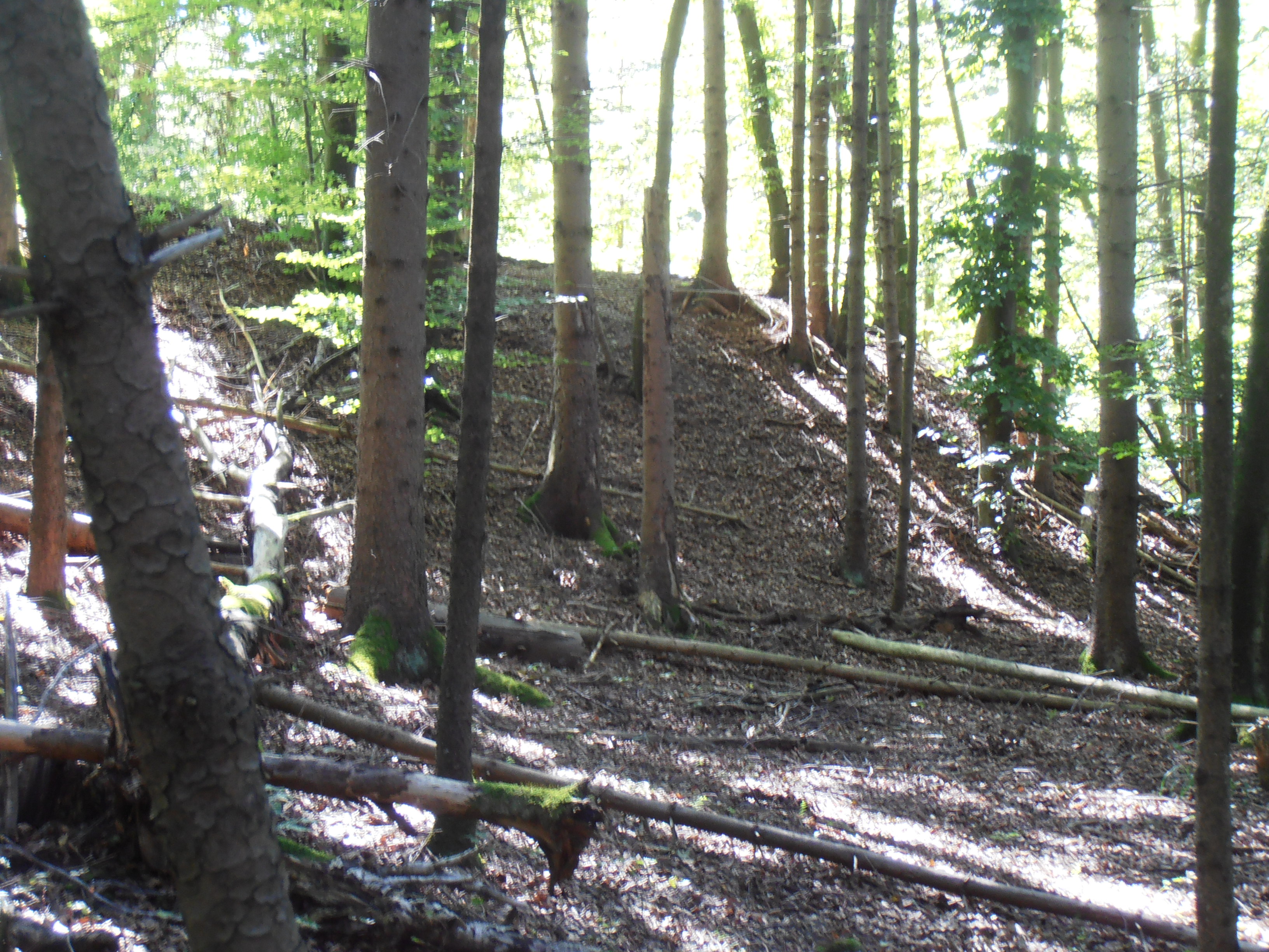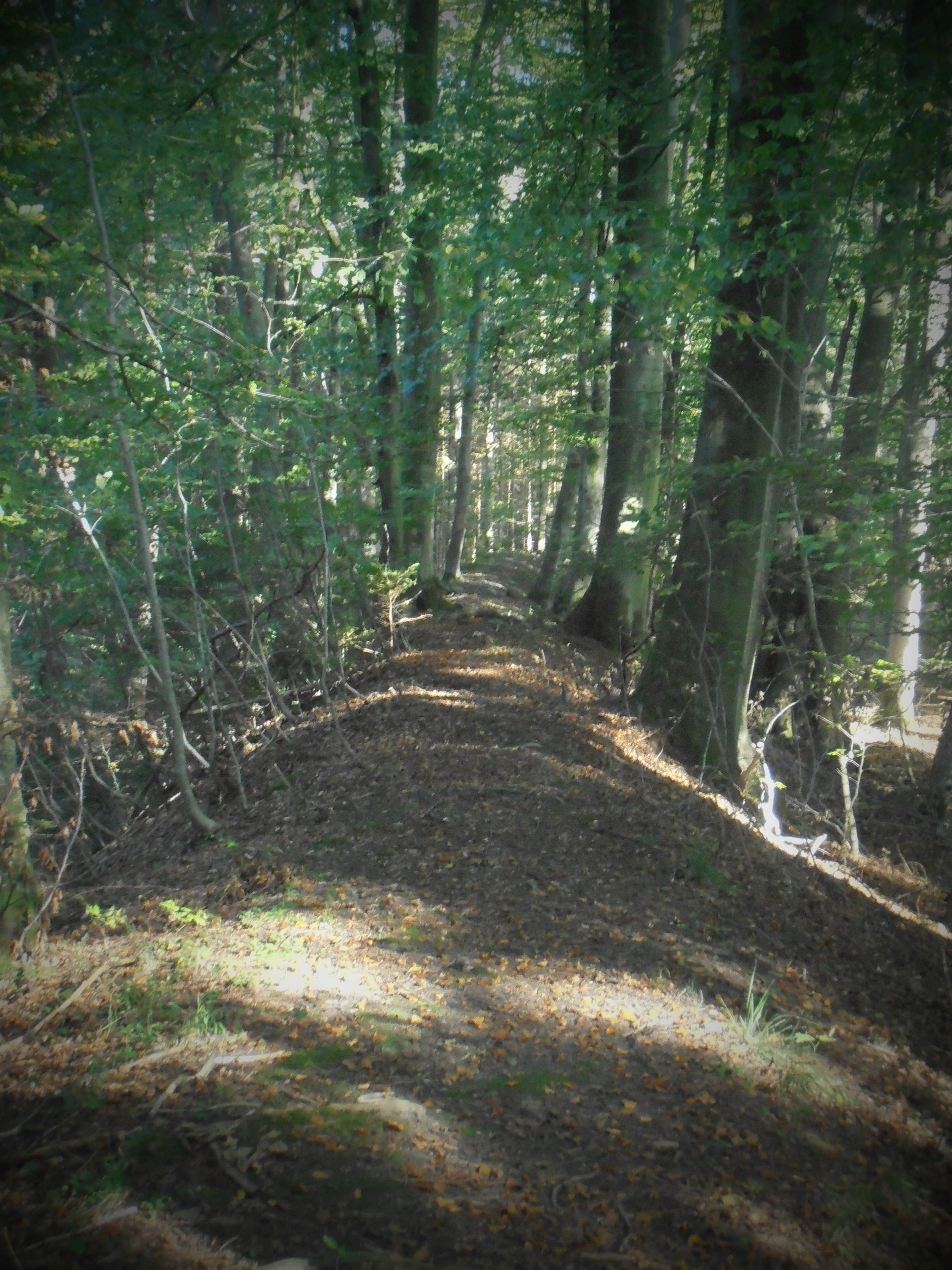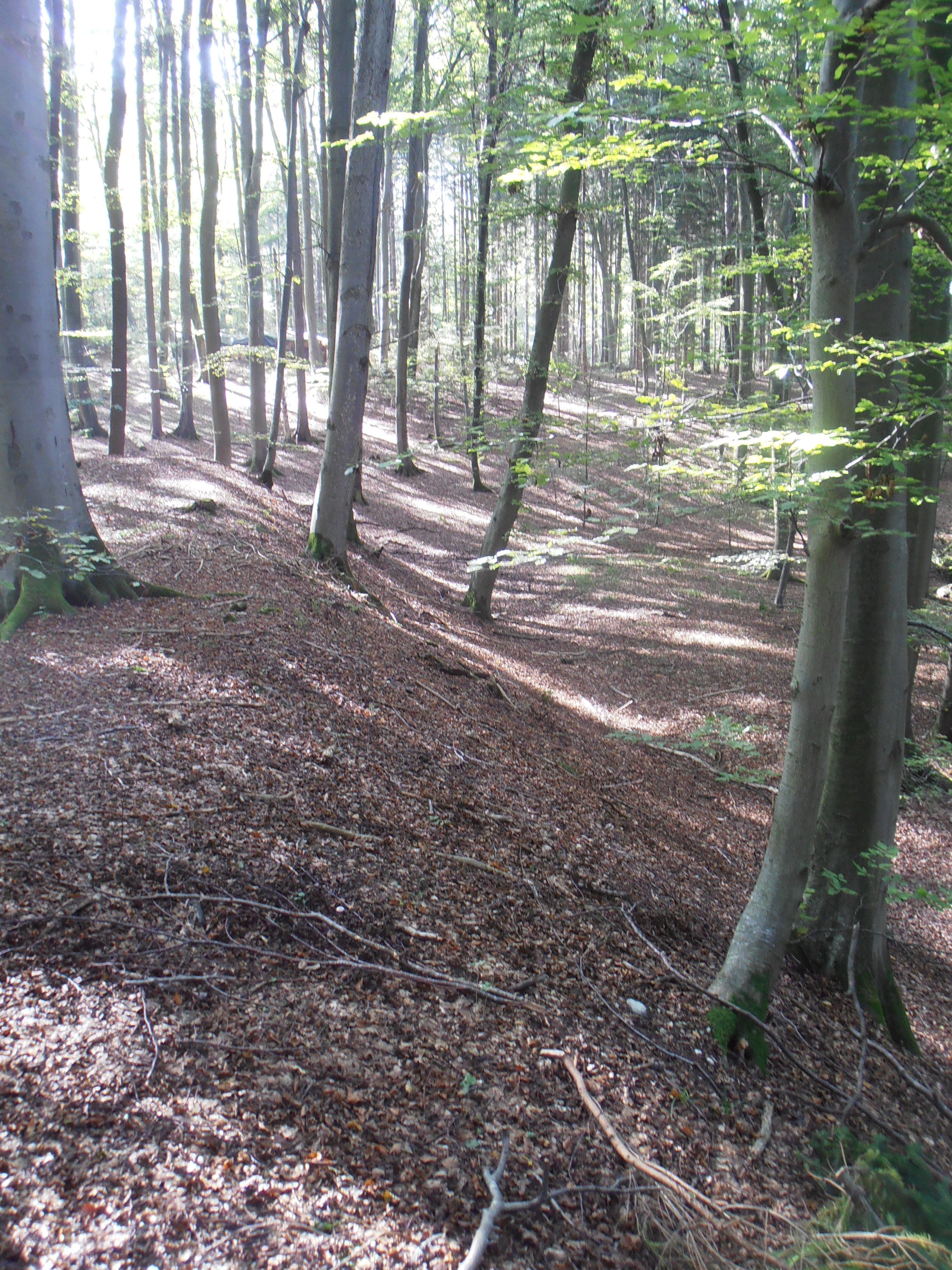 At Holzhausen 2, the forest has taken over. The ground inside the wall has filled in over time so that the earthwork is now more of a plateau. Here is the edge, from above on the wall.