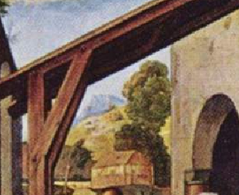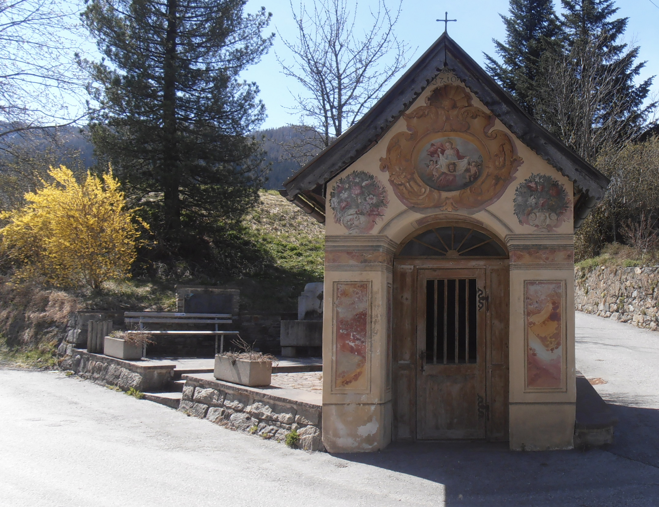 Two things about Schönberg called to mind George Washington. The first was that Goethe was here, and fortunately the small town of Schönberg has a quote to prove it. (“Goethe visited here” is the German parallel to “Washington slept here.”) On his travels to Italy in 1786 (“The Italian Journey”), the great writer penned, Up on the Brenner I saw the first larch trees, at Schönberg the first Swiss pine. This little chapel is on a spot called Goetheruhe (Goethe’s Rest) and there is indeed a Swiss pine tree on the site. The road that runs by it is called Römerstrasse, and is very likely the old road. This route through Raetia had its own alternative “bypass” route, which branched off near here and followed the upper plateau on the eastern side of the valley (and there is a “Römerstrasse” up there today too.)