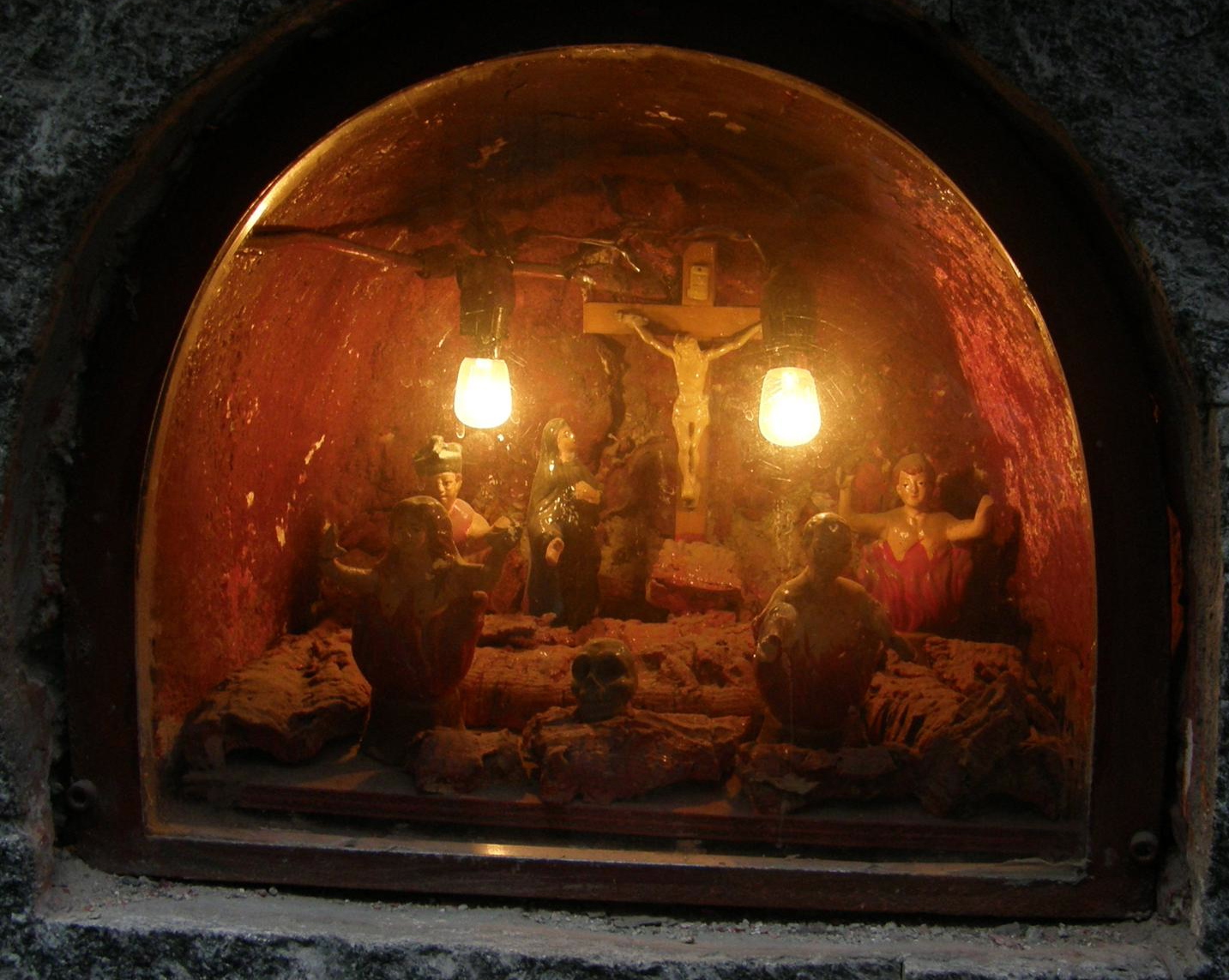 UPDATE 2: Reader Paschberg sends this image of another representation of Hell, found embedded in a stone wall in Naples. Here the (burning) subjects seem to be aware of the glass, and press on it as if trying to escape.