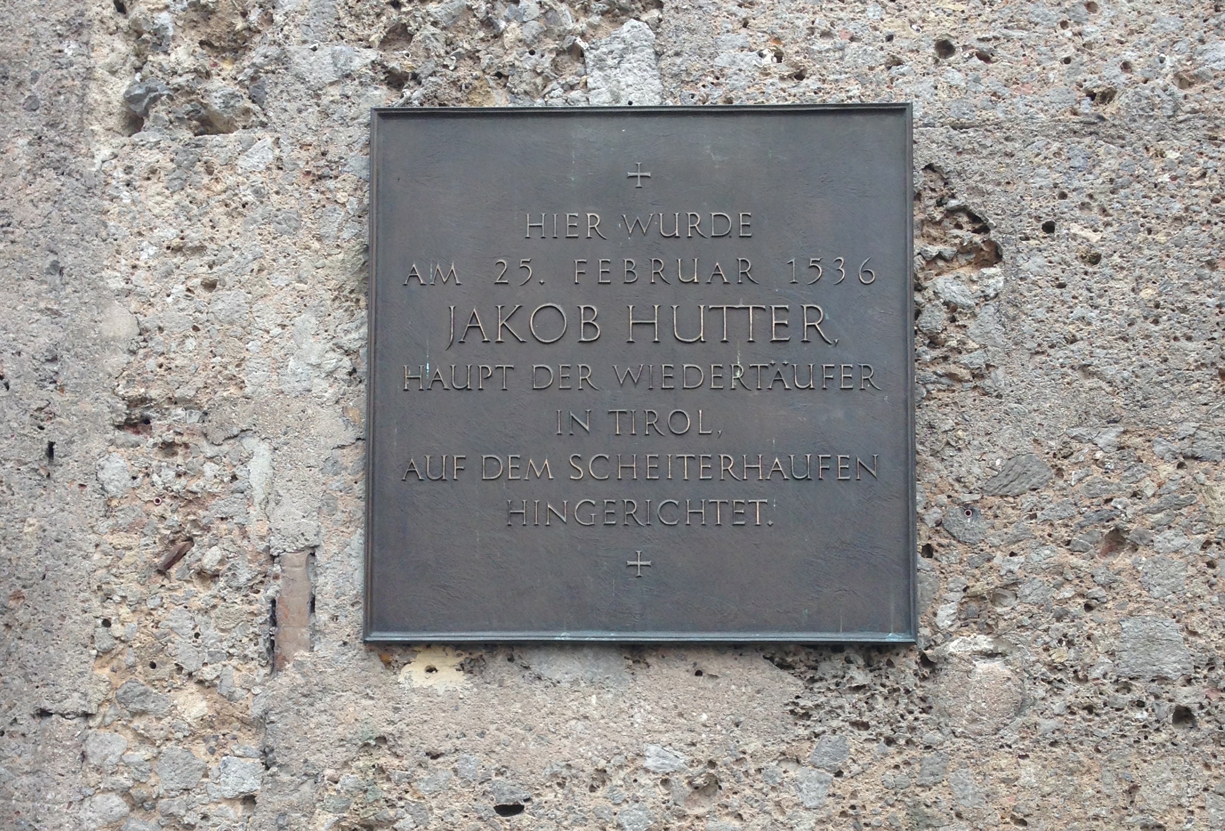 This plaque, found on the stone wall underneath the Golden Roof in Innsbruck’s old town, says: Here, on 25 February 1536, Jakob Hutter, head of the Anabaptists in Tirol, was burned at the stake.