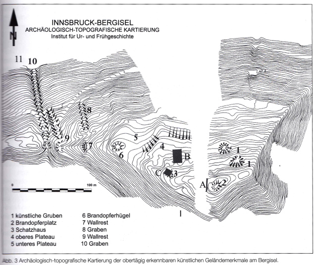 Top image is a screenshot from Bing Maps. Bottom image is from “Ur- and Frühgeschichte von Innsbruck” (“Prehistoric and Protohistoric Archaeology of Innsbruck”) catalog accompanying the 2007 exhibit at the Tiroler Landesmuseum Ferdinandeum, Innsbruck. In German.