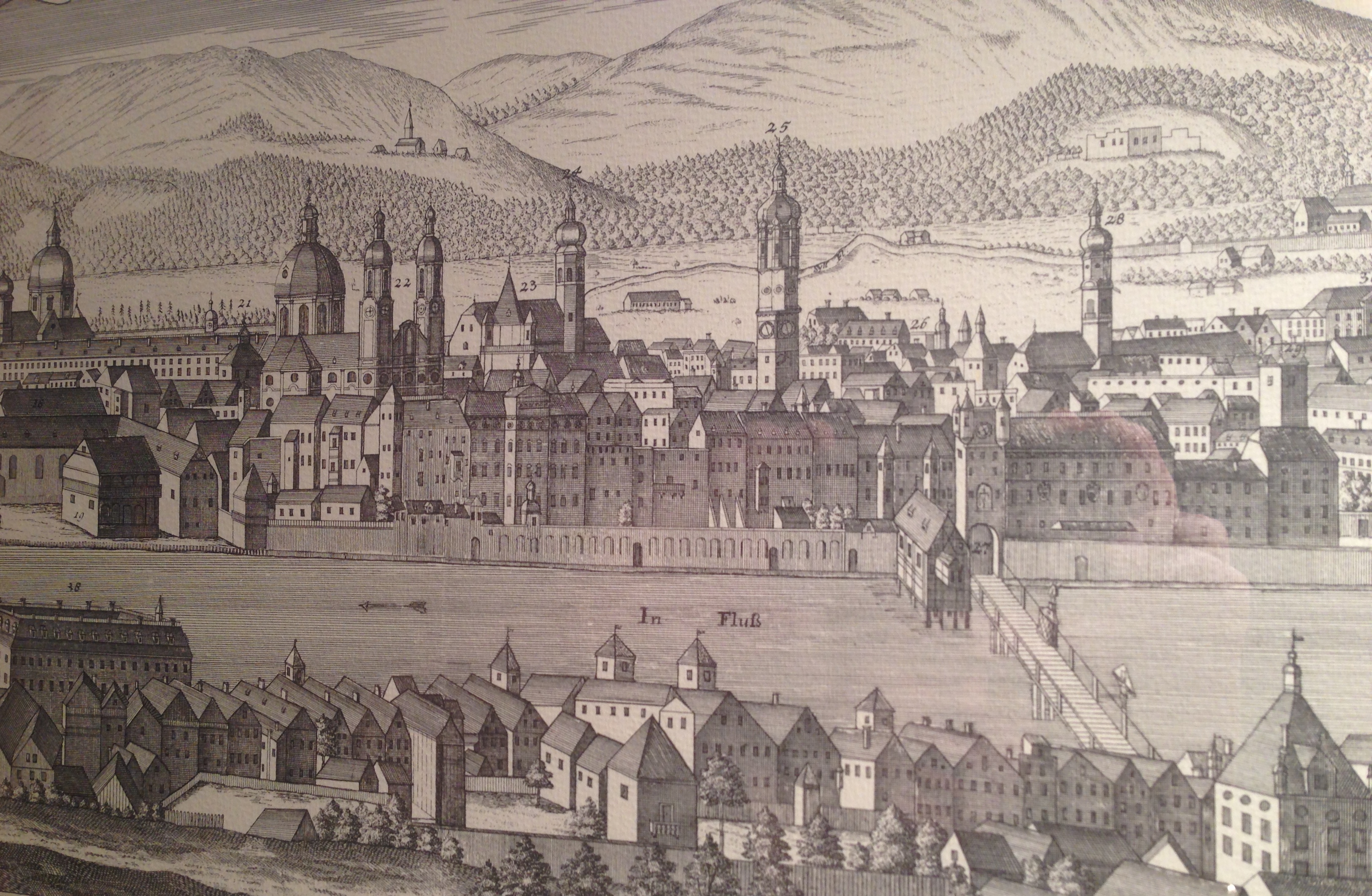 Hier ist ein etwas später Ansicht (Matthäus Merian, Martin Zeiller, Topographia Provinciarum Austriacarum , 3 Ausgabe , Frankfurt am Main 1679 ) Der Inn ist deutlich schmaler dargestellt, fast wie ein Schlauchrutsche im Wasserpark, aber ich muss annehmen, dass die Stadt selbst mehr oder weniger genau dargestellt wurde. Zu diesem Zeitpunkt ist der Stadtturm mit seinem 1560 dazugebauten Zwiebelhelm mit Laterne etwas markanter.