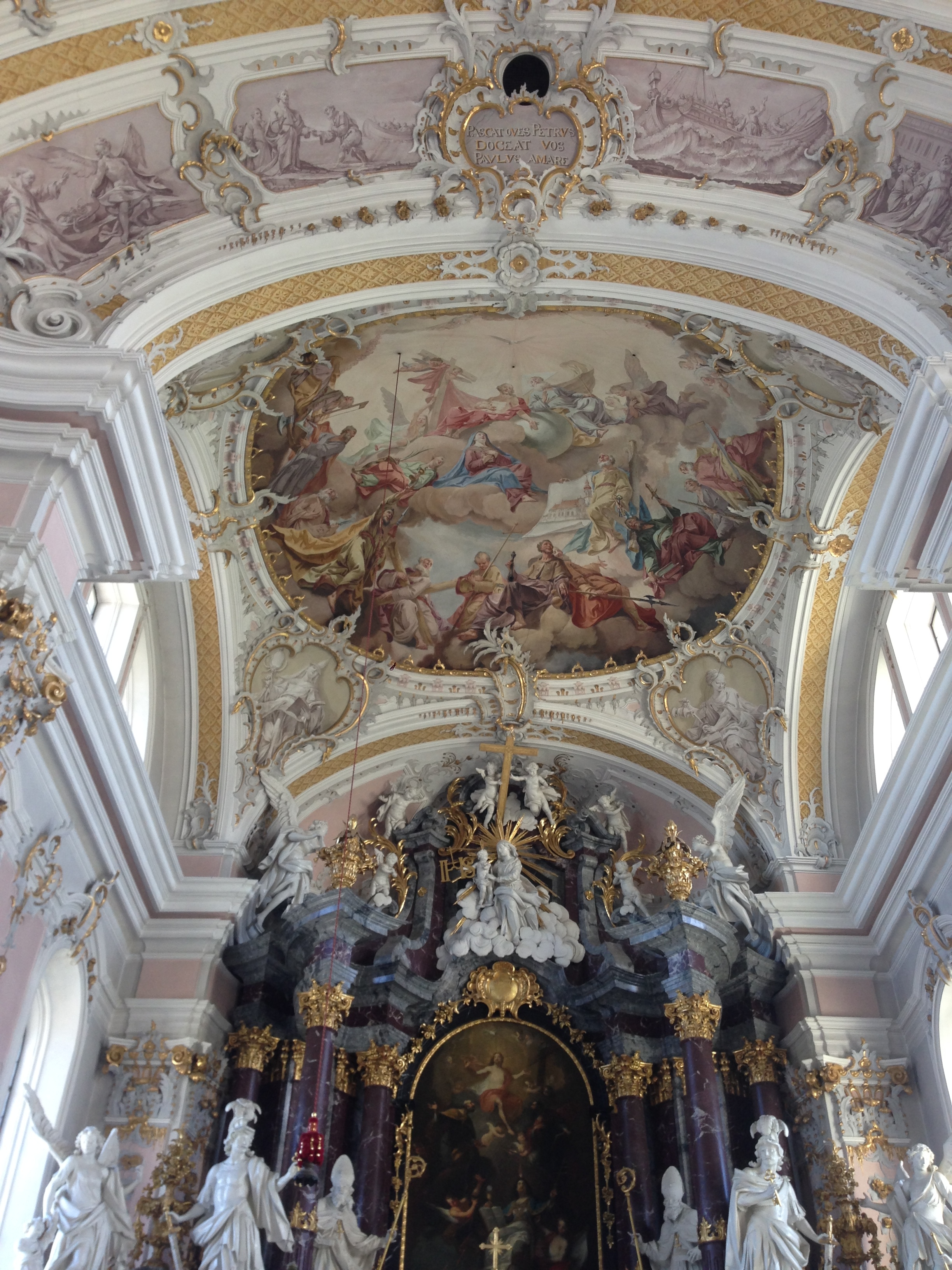 The church’s interior bears a very strong resemblance to that of the Innsbruck Cathedral, with that cake-icing-and-beeswax style and color scheme; although they are both 18th century works, as far as I can tell they are by completely different artists. // Der Innenraum der Kirche hat große Ähnlichkeit mit der Innsbrucker Dom, mit diesem Zuckerbäcker-und Bienenwachs-Stil entsprechende Farbgebung; obwohl sie beide Werke aus dem 18. Jahrhundert sind, gehe ich davon aus, dass sie von ganz verschiedenen Künstler gestaltet wurden.