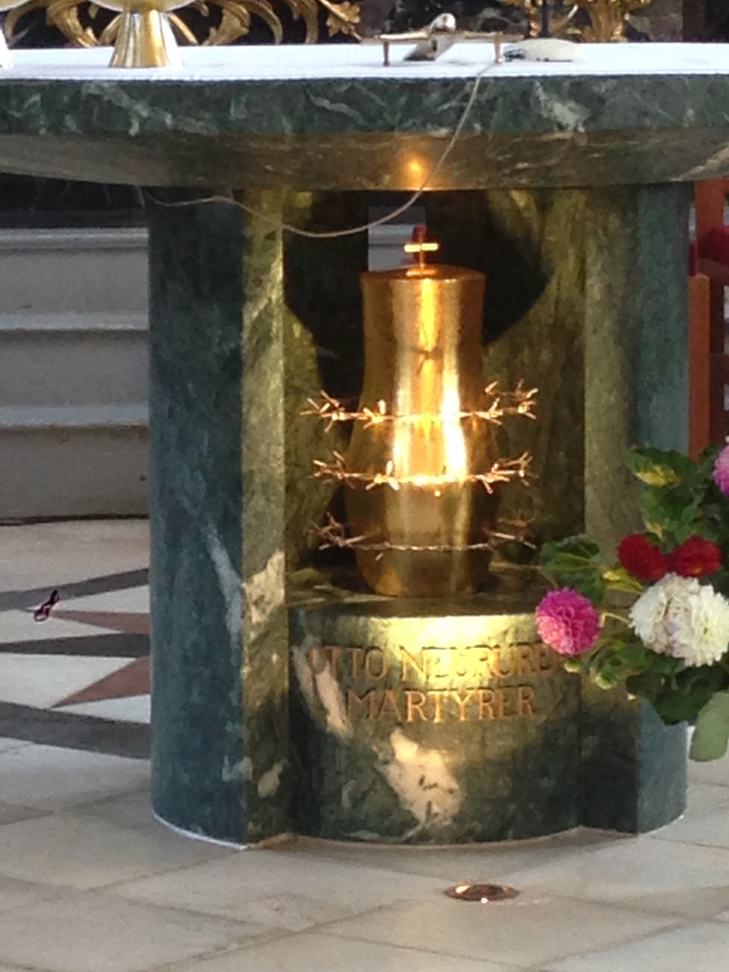 Father Neururer’s ashes were returned to Götzens, and the church has them in a golden urn, ringed with Dornenkronen, displayed prominently underneath the altar. // Pater Neururers Asche wurde nach Götzens gebracht, und die Kirche hat sie in einer goldenen Urne mit Dornenkronen herum, prominent unter dem Altar präsentiert.