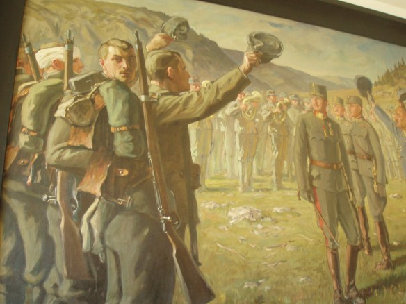 In one room my eyes rested on a large painting of soldiers greeting Kaiser Karl, the last Emperor of Austria. I found interesting the one soldier turning to look directly at the painter, and so my eyes dropped down to read the artist’s signature.